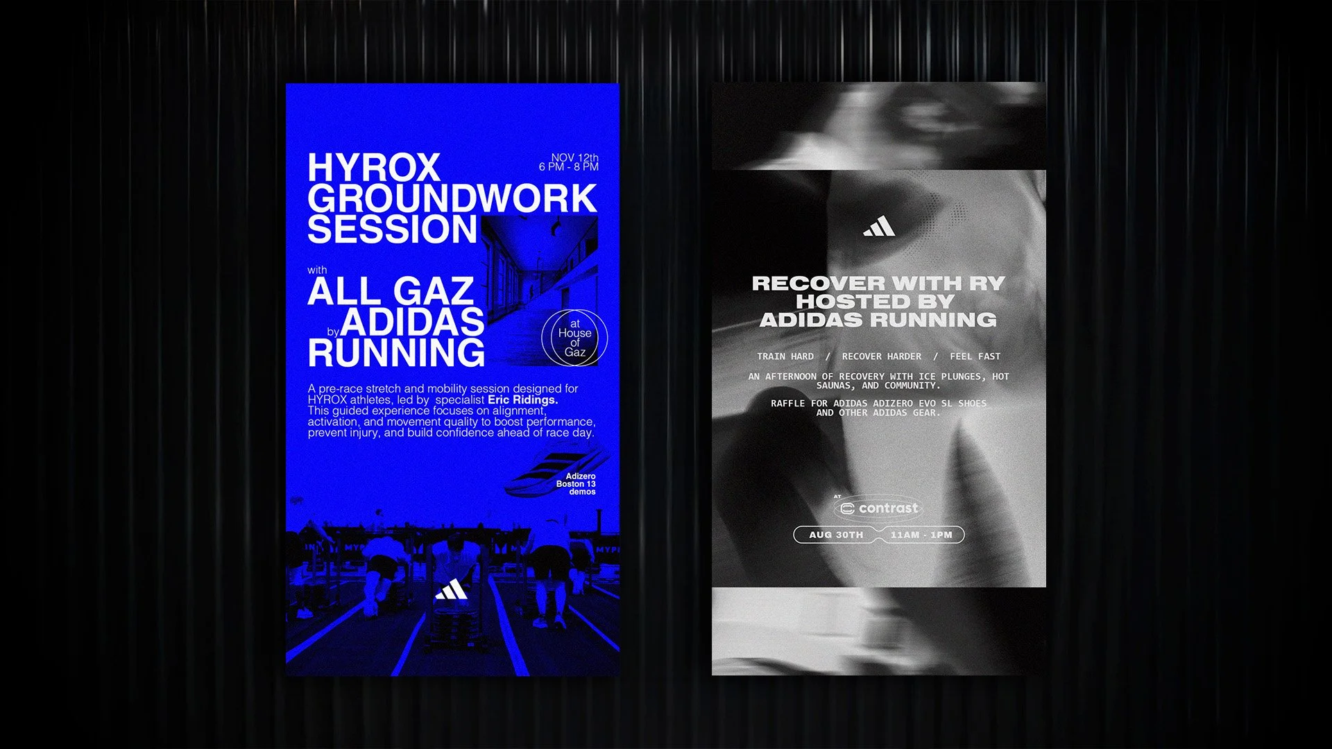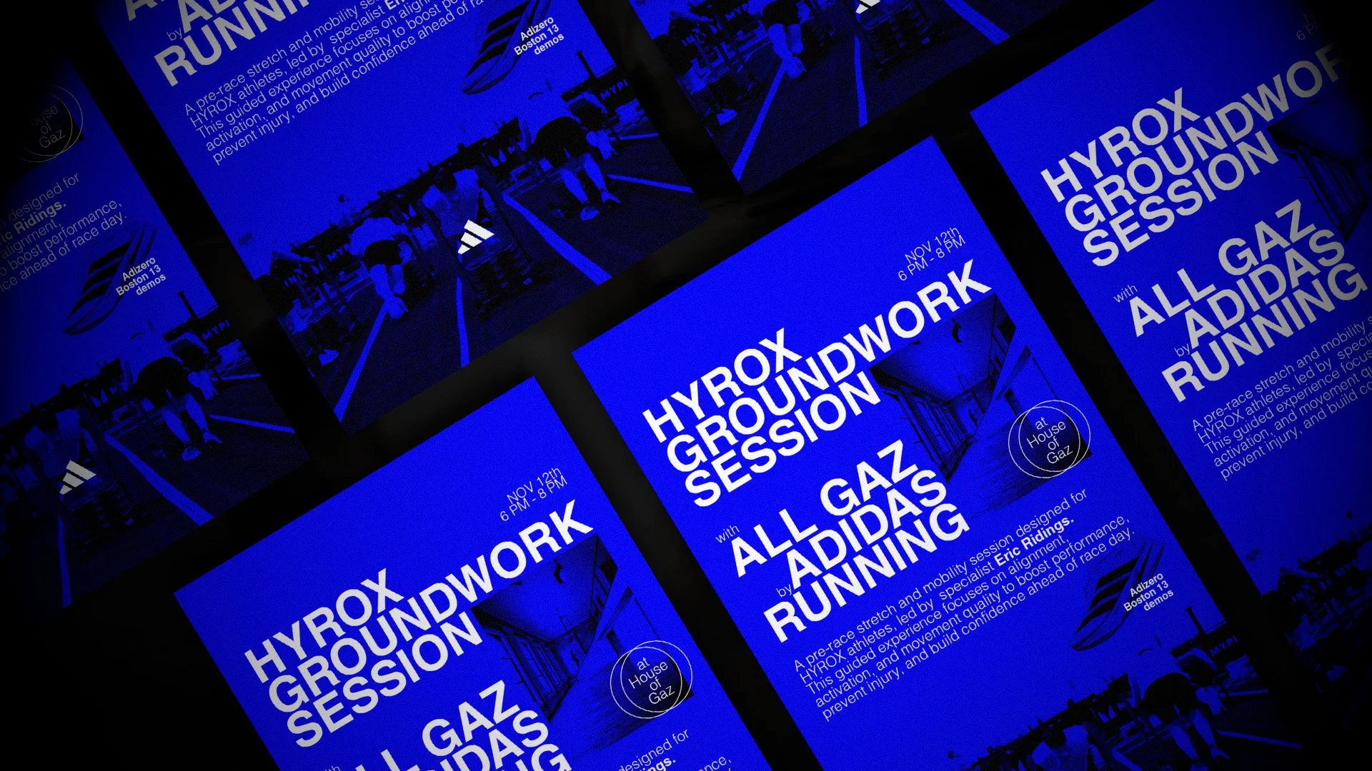 A full in-house design project for Adidas Running. We created a cohesive set of posters and event flyers for the Hyrox Groundwork Session and the Recover With Ry event. All photography and visual elements were produced by GAZ allowing us to shape a unified look that reflects movement, recovery, and the spirit of the Chicago running community.