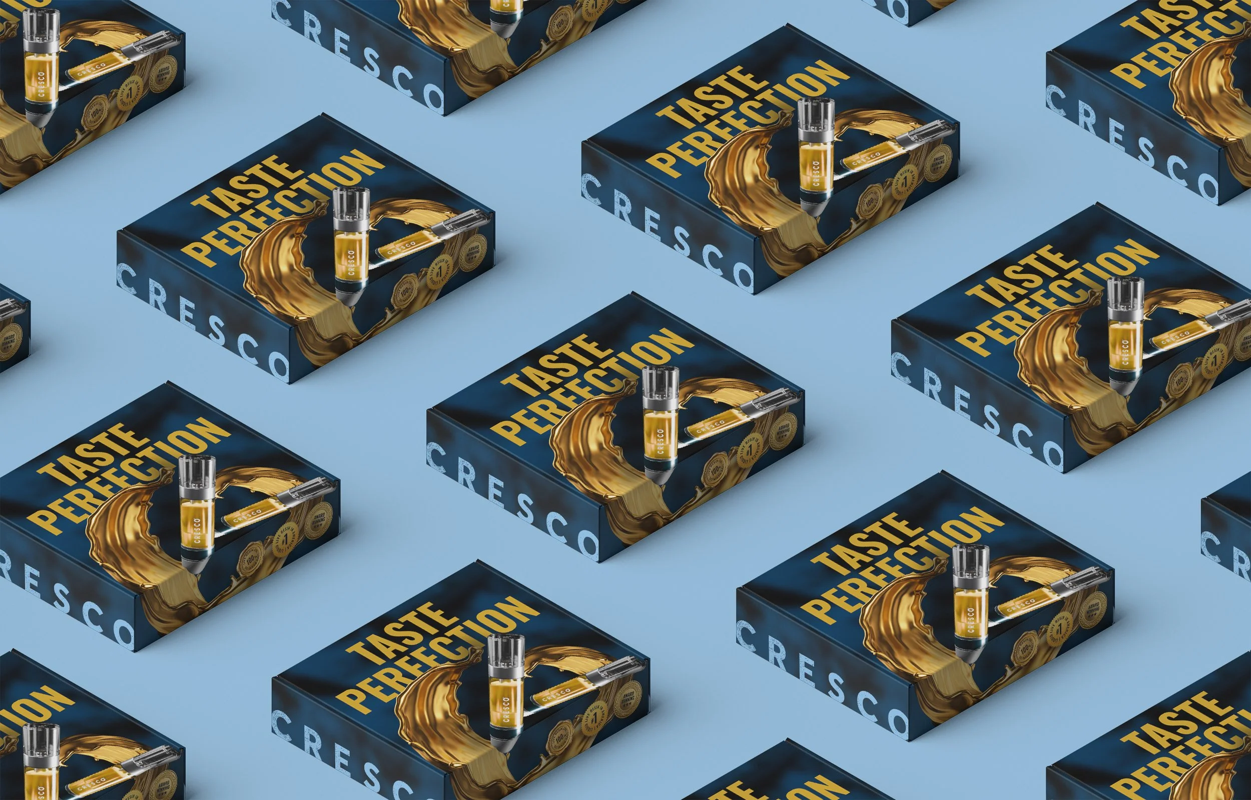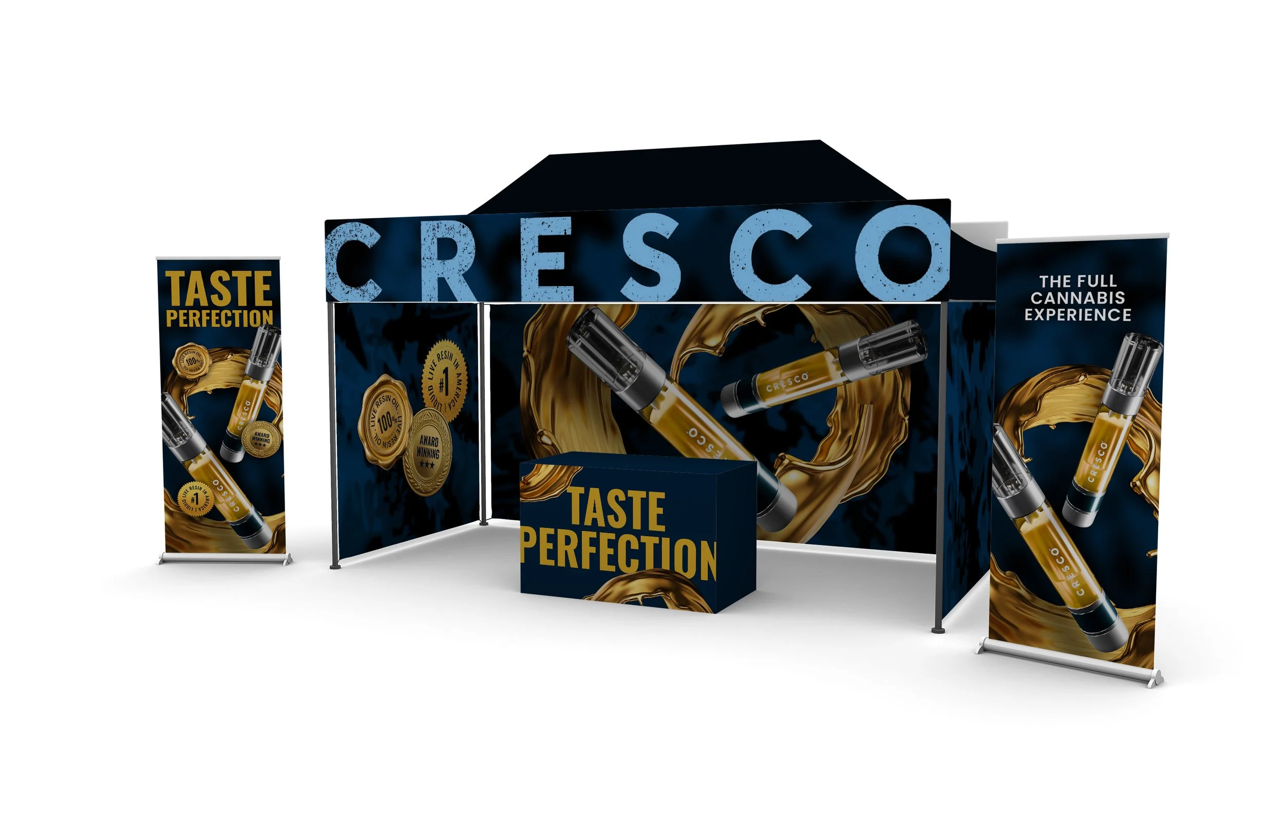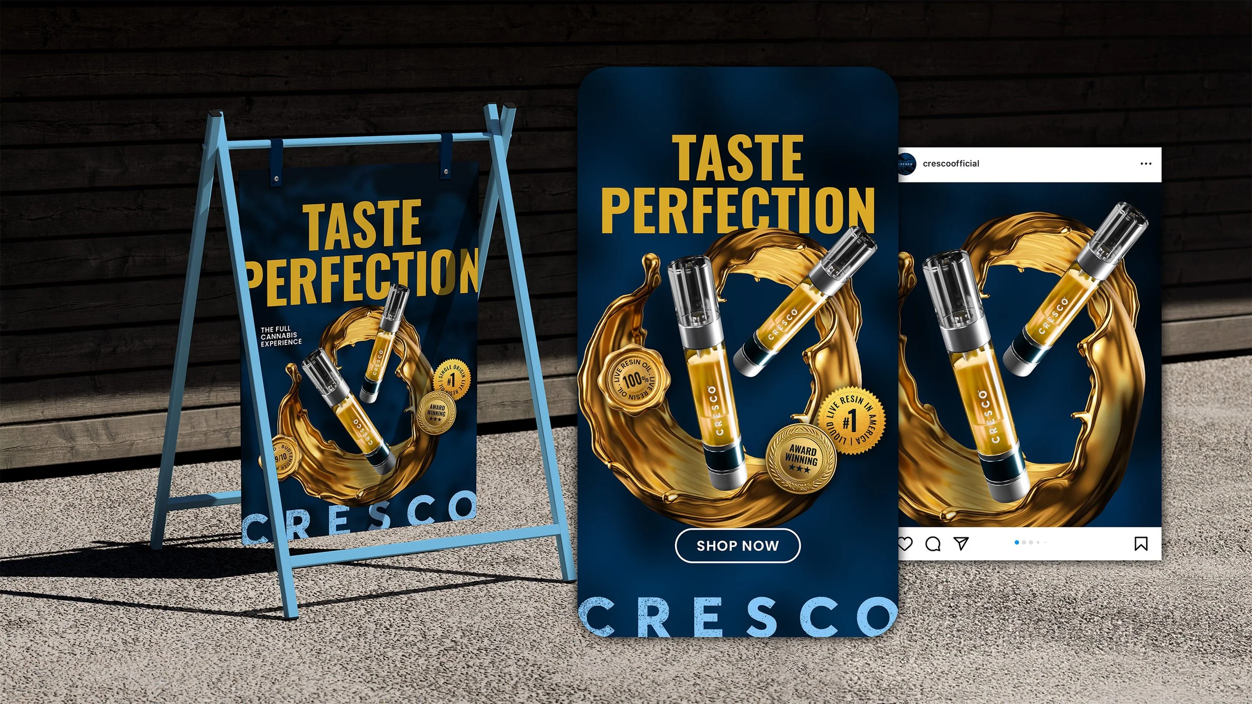 A full brand campaign created for Cresco to highlight the quality and flavor of their Liquid Live Resin line. The visual direction centered on rich gold resin textures contrasted with deep blues to create a premium and recognizable look across all touchpoints. We designed event displays, packaging, digital assets, and large format signage to build a unified presence for the brand. Every piece was developed in house to deliver a bold and consistent identity for Cresco’s signature LLR experience.